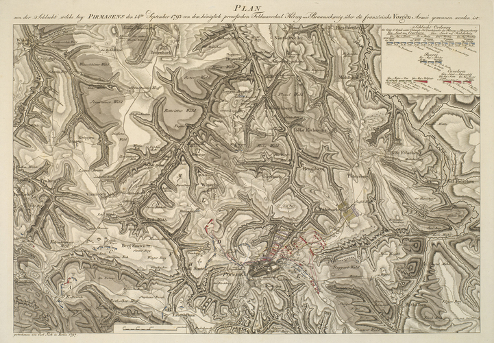 Title image: A map of the Battle of Pirmasens, fought on 14 September 1793 between the Prussians and Austrians commanded by Lieutenant-General Wilhelm René de l’Homme de Courbière (1733-1811), and the Corps de Vosges of the French army commanded by General Balthasar Alexis Henri Antoine von Schauenberg (1748-1831), resulting in an Allied victory.