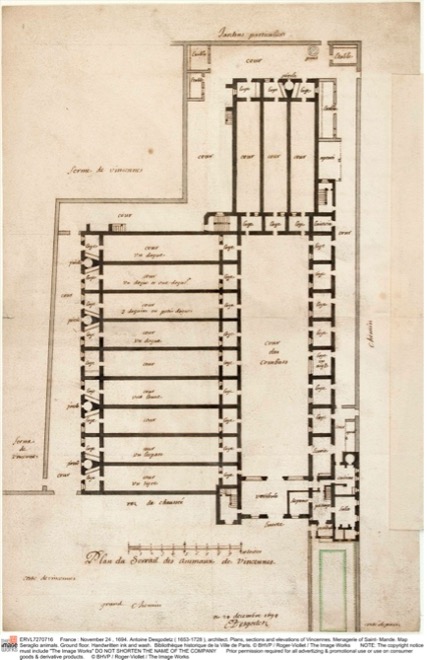First, in a striking pivot, when the young Louis XIV ordered the Royal Menagerie to be built, he turned his back on a long royal and princely tradition in France and elsewhere of keeping wild animals at court, especially for combat. Ever since Pepin the Short, and especially during the Renaissance, French kings laid claim to their strength and legitimate authority through their collections of ferocious and violent beasts—lions, tigers, bears—and the staging of animal fights. Spectacles of violent animal combat lost favor with the advent of the Bourbon dynasty with Henry IV in 1594, amidst the horrors of religious war. This remained the case under Louis XIII, who had himself already taken the avian turn (especially with the bird collection at Fontainebleau, and his passion for falconry).[3] Though the great cats all but vanished, Cardinal Mazarin and the young Jean-Baptiste Colbert, later chief minister of the king, nonetheless built a special kind of menagerie at the chateau of Vincennes. Begun in 1654, the menagerie was used to satisfy the carnivorous appetites of the court. But in 1658, under Mazarin’s direction, the architect Louis Le Vau—after some trial and error—eventually added an adaptation of the Florentine model of a seraglio of wild beasts (Fig. 2: Vincennes).[4]