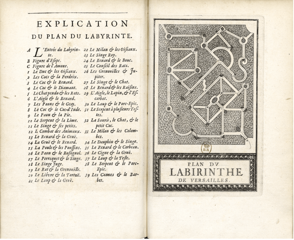 Like the Royal Menagerie, the Royal Labyrinth was deeply embedded in court culture. Even before Louis XIV commissioned the statuary, and before the first waterworks in 1666, the Labyrinth was a site of gallant festivities, as during the Plaisirs de l’ile enchantée in June 1665. Then between 1672 and 1674, the crown commissioner hired more than three dozen fountain engineers (including the erstwhile poet of the Menagerie and the Labyrinth, Claude Denis) to lay the waterworks for the fountains, and more than a score of talented sculptors (including Jacques Houzeau, Pierre Le Gros, Jean-Baptiste Tuby, Antoine Masson, and Etienne Le Hongre) to produce the fabled animals for the 39 fountains installed at the alley’s intersections. The animals, arranged in scenes of confrontation, each spouted variable streams of water that expressed “their passions and their thoughts,” according to Charles Perrault, to whom the official guidebook to the Royal Labyrinth is universally attributed. Printed by the Royal Press, the guide included a map and key, an unadorned description of the fountains, their engravings by Sébastien Leclerc, and the morals of the fables, quatrains authored by the court lyricist Isaac de Benserade, which were also inscribed in gold on black painted marble plaques at the foot of each fountain. The guide went through two editions and countless pirated versions for those who wished to play at home (Fig. 5).