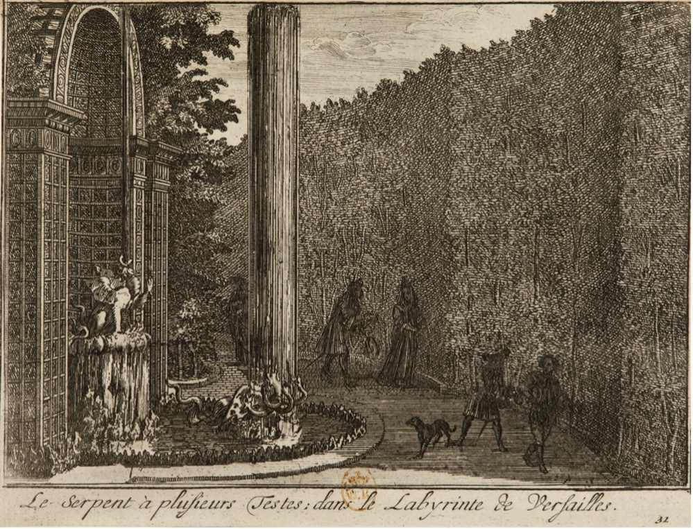 In the first decade of his long reign, and well before the court was installed at Versailles in 1682, Louis XIV established two distinctive animal collections in the palace gardens. The first was the Royal Menagerie, a pavilion designed by the architect Louis Le Vau in 1663 at the edge of the park on the road to Saint-Cyr, with its seven courtyards populated by 1668 with thousands of exotic and domestic animals, mostly birds. The second was the Royal Labyrinth, designed by André le Nôtre. An irregular garden maze also planted in 1663, the Labyrinth was populated between 1672 and 1674 with 39 fountains and some 330 polychromatic lead sculptures of animals enacting fables “drawn from Aesop.” The history of these two animal collections has hardly been ignored, but they are rarely considered together, especially in the context of Louis XIV’s early efforts to construct a model of absolute authority in the gardens of Versailles.[1]
