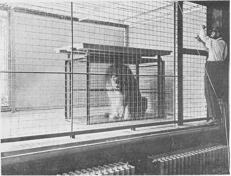 Loisel was responding to varied input from animaliers, and the ongoing desire for more traditional proximity to animals was met in two ways. First, there was to be a gallery beneath the artificial hills with cages along the sides and a service corridor behind them that artists could access to view the animals from various angles. In addition, a building perpendicular to this gallery included a central studio. Loisel envisaged animals being brought to this studio in a mobile cage from throughout the garden to be drawn, painted, and sculpted. In this, Loisel, who underscored his study of the artistic use of zoos during his missions, was inspired by a studio reserved for artists in the New York Zoological Park’s Lion House (1903). There, a shift cage could circulate on rails in the service corridor between the inside and outside cages. This cage could then be lifted into the studio space, the animal could be let go, and the cage could be lowered. A photograph of the studio [Figure 3] shows a lion in the mobile cage, which in turn is inside a larger enclosure fronted by large-mesh, steel-wire netting. The big cat is thus doubly captive. While Loisel’s proposed studio, like the one in the Bronx, was designed to facilitate the work of animaliers, little thought appears to have been given to the potential trauma to the animals of being moved around according to artistic whims.[17]