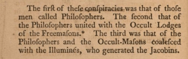 [4] John Robinson, Proofs of a Conspiracy against all the Religions and Governments of Europe, carried on in the secret meetings of Free Masons, Illuminati, and Reading Societies, 3rd ed. (Philadelphia: T. Dobson, 1798).