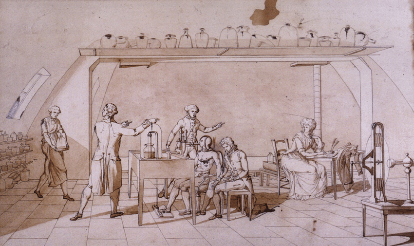 But what of the initial conclusions the Museum team has drawn about these changes, which they insist fundamentally change how we should think about the Lavoisiers and their scientific work? In The Burlington Magazine, David Pullins, Dorothy Mahon, and Silvia A. Centeno claim these changes prove that the couple made an “about-face from fashion to science.”[3] In an article in Heritage Science, Centeno, Mahon, Federico Carò, and Pullins claim that this sudden identity crisis was a response to the “quickly changing historical circumstance in which the artist and his sitters found themselves on the brink of the French Revolution.”[4]These claims call for greater scrutiny. Considering the revisions from the perspective of the history of science on the eve of the Revolution suggests other, more nuanced interpretations of the changes made to the portrait.