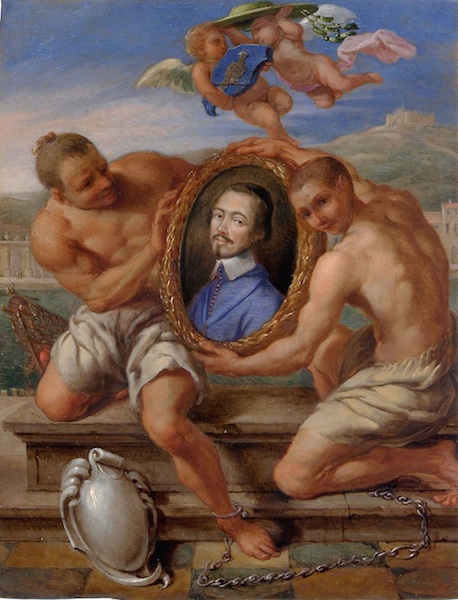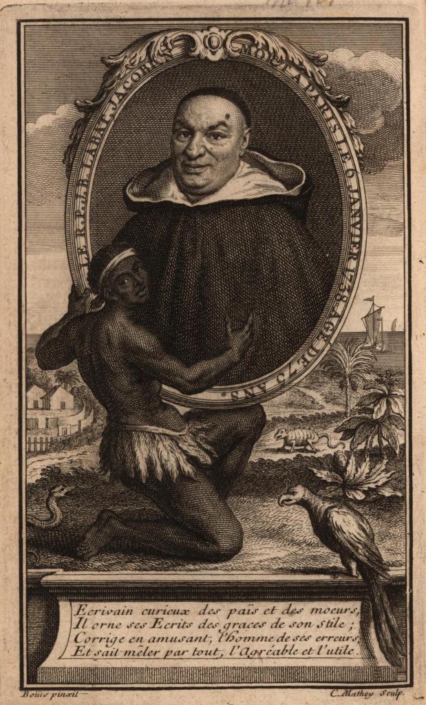 A similar convergence between Mediterranean and Atlantic also makes a visual appearance in representations of galley slaves and enslaved West Africans paying homage to white sitters. One suggestive example is Jean-Baptiste de Faudran’s c. 1660s painting of Marseille’s archbishop Jean-Baptiste Gault encircled by a shackled forçat and distinctively topknotted Turc. The painting finds echoes several decades later in an engraved frontispiece for the 1742 edition of Dominican missionary Jean-Baptiste Labat’s Nouveau voyages aux isles de l’Amérique. Made after a work by Provençal artist André Bouys (1656-1740), whose brother was official painter for the city of Marseille, it depicts a presumably enslaved West African holding an oval medallion of the tome’s author, who ministered to enslaved populations in the Caribbean between 1693 and 1706.[11] Could Bouys have been recalling this earlier portrait or others like it when he composed his image? The poses, bodies, attire, and gazes of the enslaved men in both pictures is markedly similar, as are the effigies of the clerics and the details of the settings—only with a Caribbean landscape and a plantation substituting for Marseille’s naval arsenal and port.