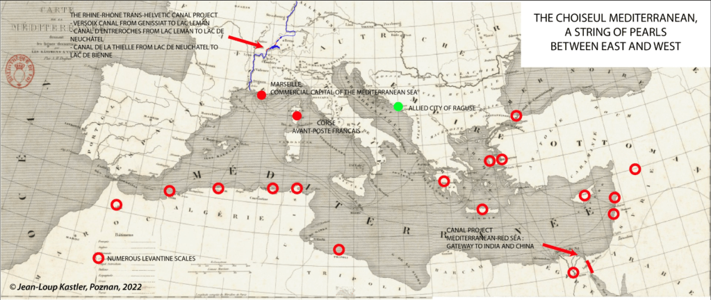 In the case of Poland, as in that of Versoix, Choiseul was in fact pursuing the same dream: to turn the Mediterranean Sea into a French lake. This summary map, which I have produced from the available data on this subject, bears witness to the coherence of the project.