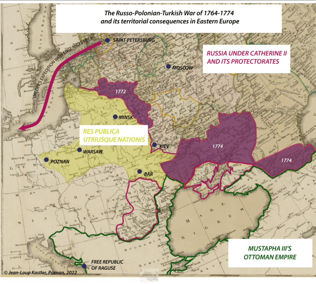 This explains the French monarchy’s involvement in Poland against the Russian invasion of 1764. The Russo-Polish war wanted by Catherine II was in fact one facet of a much broader project aimed at guaranteeing Russia access to the Mediterranean Sea. The result was a Russo-Polonian-Turkish war in which Catherine II presented herself as the natural protector of oppressed Orthodox minorities in both Poland and the Ottoman Empire.