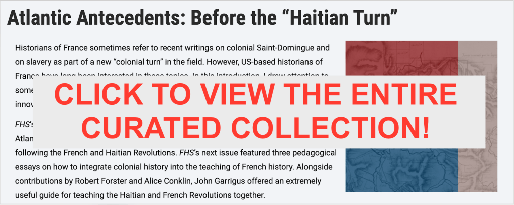 Certainly, colonial topics have become much more prevalent in FHS in this century, from John Garrigus’s excellent Spring 2000 essay “Black Jacobins/White Jacobins: Bringing the Haitian and French Revolutions Together in the Classroom” to new Haiti or French Caribbean-themed articles in the February and August 2024 issues. But these early publications remind us that research on slavery and the Caribbean is not a new fad in French history, but has been a core part of US historians’ interest in France since the earliest days of SFHS and French Historical Studies.