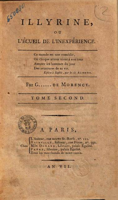 [12] Suzanne Giroust de Morency, Illyrine, ou l’écueil de l’inexpérience (Chez l’Auteur/Rainville/Mlle Durand/Favre/Les marchands de nouveautés, 1799-1800) vol. 3, 301.