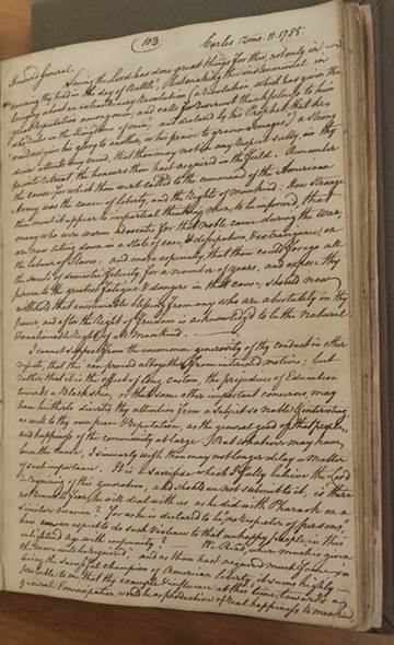 The concerned Quaker, or Friend, urged Washington to remember that he had lately risked his life for the glorious cause of liberty. Strange then, Pleasants mused, that he should return home and rest in “a state of ease, dissipation, and extravagance on the labor of slaves.” How could a man such as Washington, Pleasants wondered, a man who had been prepared to lay down his life in the name of liberty, be capable of denying that “inestimable blessing” to those who were “absolutely in [his] power.” By championing emancipation, not only would Washington resolve this glaring hypocrisy, but his efforts would surely be honored as “crowning the great acts of his life.” Pleasants concluded by acknowledging that the “Honour’d General” may find such a frank address from a mere acquaintance to be presumptuous. However, his convictions that the moral health of the retired general and the nation were at stake compelled him to be bold. Washington’s response–if he supplied one at all–is unknown.[i]